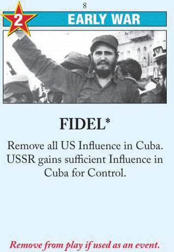 If a player is not eligible to use the event on a card, they must use the Action Points. Similarly, some events are dependent on specific locations, control of particular areas, the presence of certain characters, etc. In Empires of the Void II, for example, events can be tied to specific planets, and if those planets are not in play or the planet’s condition does not match the event’s prerequisites, the player may only use the card for its point value, rather than the event. In World War II: Barbarossa to Berlin, there are prerequisite events that must be triggered before other following events may be used. This helps pre-vent anachronisms in games that model historical events. It can also ensure proper cause-and-effect in the narrative flow of a game. Twilight Struggle takes this enforcement of sequencing even further by automatically triggering your opponent’s Event when you play a card featuring such an event for its Action Points. For example, the Warsaw Pact event is a USSR event. If the US player plays the card, he or she must use the three Action Points, but the USSR will still get to perform the Event. On the Illustration 3.3 The “Fidel” card in Twilight Struggle can either be used for two Action Points (the number in the upper left) or for the Fidel event. The Red Star icon shows that the event favors the Soviet player and will trigger even if the US player uses the card for its Action Points.
