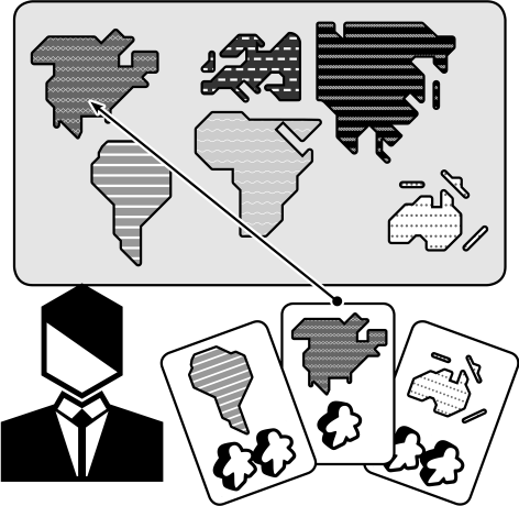 玩家持有一手牌,代表不同的地理区域或单位类型,并且每回合必须打出一张。当打出地理区域卡时,指定区域中的单位可以采取动作。如果打出单位类型卡,则只有该类型的单位可以采取动作。在《大战回忆录》(Memoir ‘44)中,卡牌代表中央、左翼或右翼;或者是单位集合,例如所有坦克单位。玩家可以根据手中的卡牌计划他们未来的动作。手牌上限有助于定义信息视界和玩家可以进行的预判量。玩家可能会尝试在特定区域积累这套卡牌以策划多管齐下的攻击,或者他们可能会冒险将单位移出掩体以获得更好的射击机会,尽管手中没有另一张卡可以下一回合将单位移至安全地带。就像在真正的战斗中一样,玩家可能无法执行战术