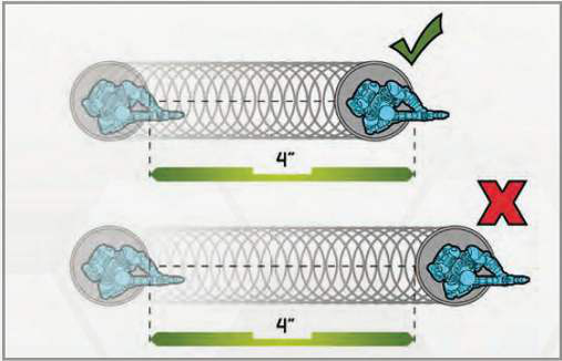 Dropzone Commander (Lewis, 2012) - 《Dropzone Commander》 Infinity (Rodriguez, 2005) - 《无限》 Warhammer Age of Sigmar (Uncredited, 2015) - 《战锤:西格玛时代》 插图10.3 《无限》规则中的测量图。它们规定移动测量是从起始处的单位基座前部到目的地的前部。