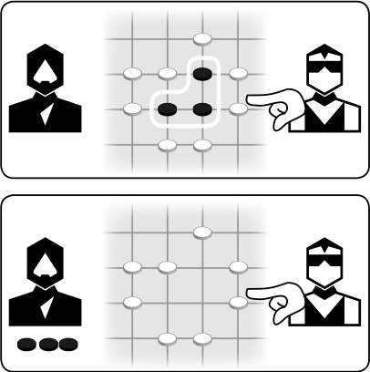 追溯到几千年前,围棋(Go)是这类冲突解决的最著名例子之一。如果一组相连的棋子没有与其相邻的空位,它就会被捕获。虽然棋子本身是静态的,但群体的演变给围棋一种动态的感觉。黑白棋(Reversi)通过允许玩家翻转位于两枚己方颜色棋子之间的对方颜色棋子来实现包围(Enclosure)。包围游戏的性质使版图上的某些区域或多或少受欢迎。在黑白棋中,角落和边缘空间更有价值,因为那里更难或不可能包围那里的棋子。同样,在围棋中,玩家通常从角落附近开始,那里更容易包围领土并确保护棋子安全,然后沿着边向中间延伸(插图4.3)。包围游戏的元素也可以在像《侍》(Samurai)这样的游戏中看到,其目标是用板块包围版图元素。这些既是