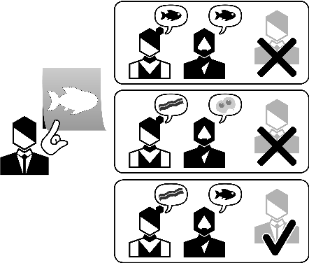 这种解决机制通常用于派对游戏或较轻松的社交游戏。核心思想是一个玩家给小组关于一个单词或短语的线索,其他玩家试图猜出答案。然而,如果没人猜对或所有人都猜对,对线索提供者来说都是坏事。当部分玩家猜对而不是全部猜对时,玩家得分最高。例如,在《Barbarossa》中,玩家制作小粘土雕塑来代表某物——例如狮子。如果没人猜出这应该是一头狮子,或者如果每个人都猜出来了,雕塑玩家不得分。他们需要制作一个介于明显和模糊之间的雕塑。《Dixit》也是如此运作,但使用的是图片。《Decrypto》是这个想法的一个变体。玩家分成两队。一队有一个包含四个单词的列表,该队的所有玩家都可以看到。线索提供者需要给出一个线索,让他们的团队从列表中选择正确的单词。另一队可以听到这些线索,但