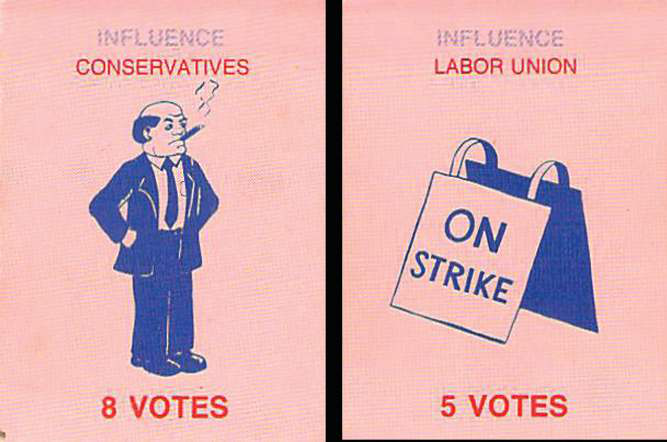 插图4.6 来自《Junta》的两张投票卡。与许多投票游戏不同,玩家获得的选票数不相等。