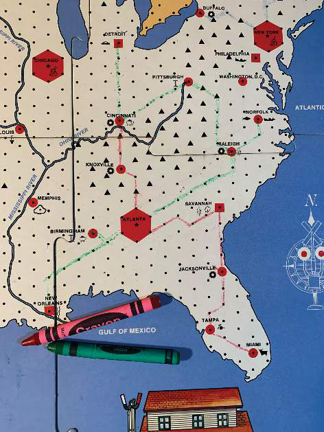 插图12.4 《Empire Builder》中用蜡笔在版图上绘制的路线。每个路段的成本取决于连接的地形不同。