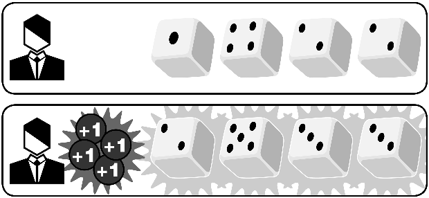 Some games offer probability manipulation at rarified skill levels. In Twilight Struggle, some cards leave the game after being played for their events. High-level players are careful not to trigger cards showing their own events, and to trigger, in as safe a manner as possible, their opponent’s events. Over time, the weight of the deck shifts and forces the opponent into many difficult hand-management situations where they must trigger highly damaging events. In Alhambra, players can draw currency into their hands, either by taking a single card, or any number of cards adding up to no more than five. Players gain a bonus action when purchasing tiles with exact change, and a great deal of the skill in this game lies in managing a hand that can match many values. Failure to realize this aspect of gameplay results in a substantial loss of player agency. Illustration 6.1 In Kingsbridge, players can earn +2 tokens, which allow them to modify future dice rolls. Here, a +2 token is used to place the 6/3 dice into the “11” space, where normally they would have to go in the “9” space.