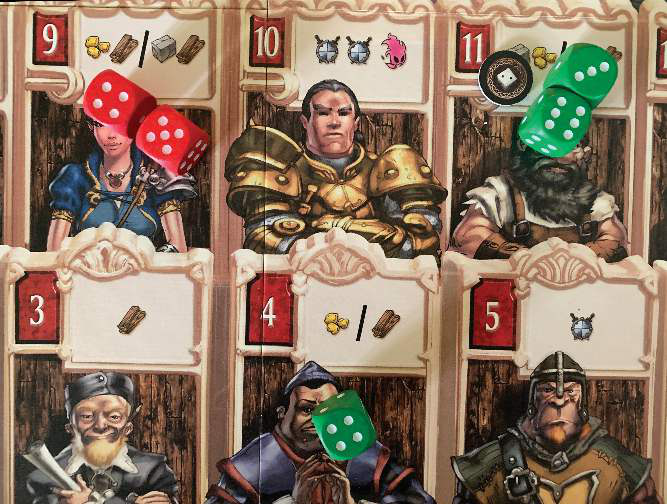 插图6.1 在《Kingsbridge》中,玩家可以获得+2代币,这允许他们修改未来的骰子滚动。在这里,一个+2代币被用来将6/3骰子放入“11”空间,而通常它们必须进入“9”空间。